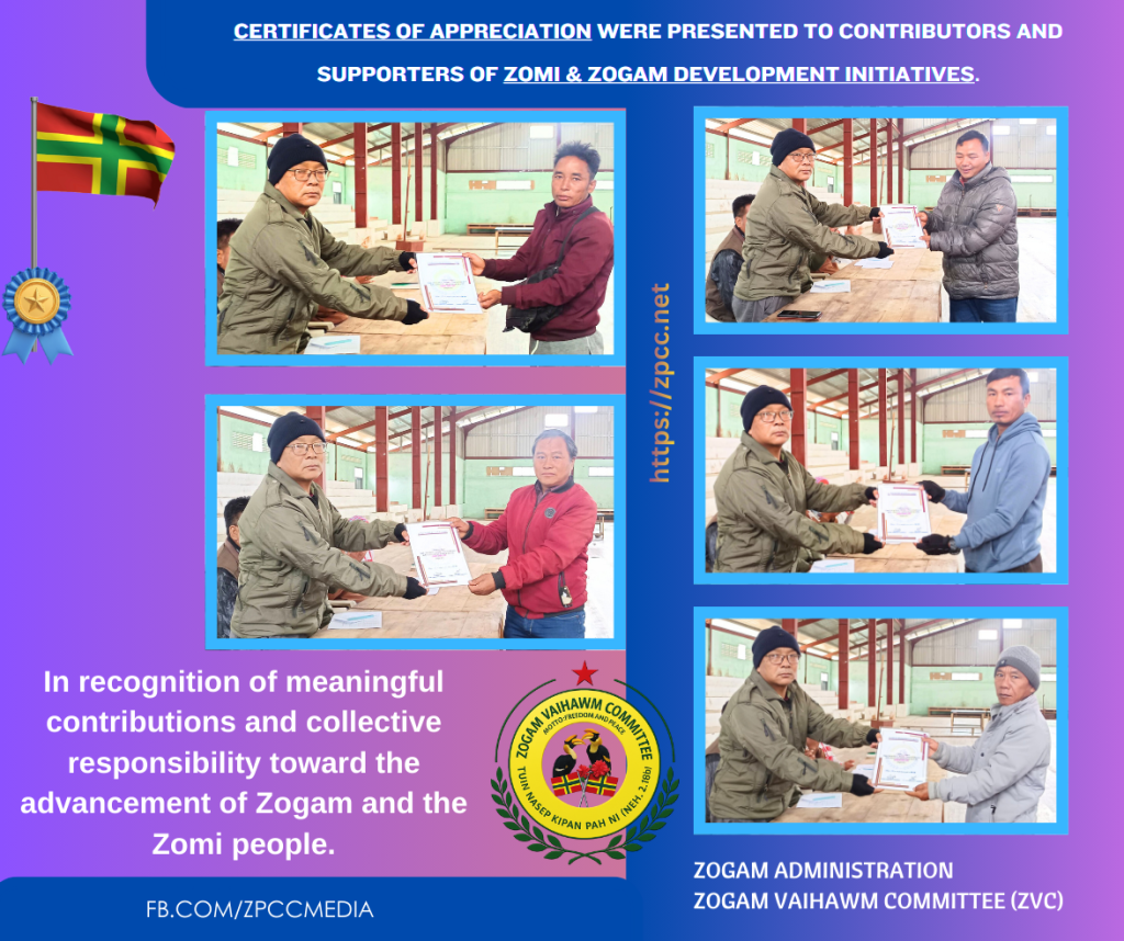 The Zogam Vaihawm Committee formally presented Certificates of Appreciation to individuals and communities who have made meaningful contributions toward the advancement of Zomi and Zogam development initiative projects.